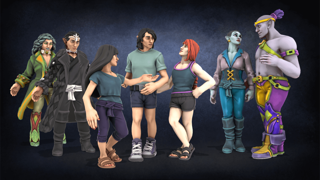 The overlapping relationships: Babe and Oyster are deeply in love, but Oyster is asexual (though panromantic). So Babe sometimes spends “quality time” with Who’s There and Septimus. Tomma is also important to both Babe and Oyster, and they’ve even proposed to zir, as a unit! Tomma loves them back, but also has a new love, Parsifal. Parsifal is married to Maud and they have a child, Breadcrumb. So Tomma’s relationship with Parsifal also includes a relationship with Maud. (Elves are usually pansexual.)
